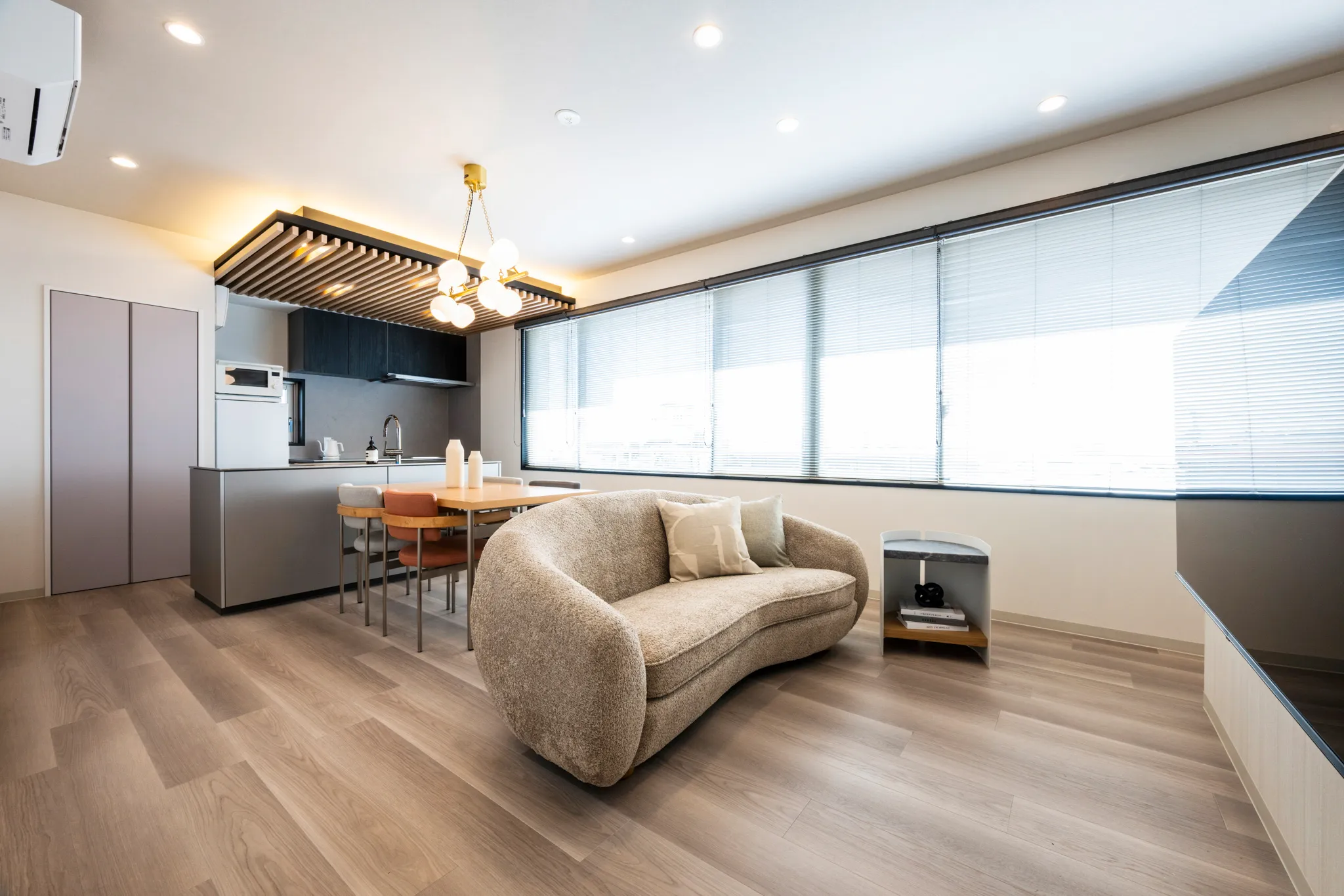 キッチン付き、洗面・トイレが独立したお部屋です。南向きで日中も暖かく心地の良い光が入る為、長期滞在にもオススメです。モダンな照明とウォールナットで統一されたインテリアは落ち着きのあるホテルのようなデザインになります。