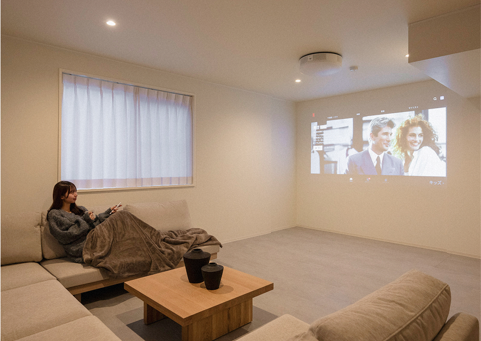 プロジェクター付きのリビングルームやオープンキッチンは、グループでの滞在におすすめのポイントです。また、ダブルベットも4台設置されているので、ゆったりとくつろげます。