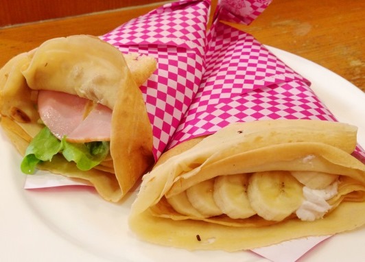 看板メニューのクレープは、注文を受けてから焼くもちもちの生地が特徴。また、店内の喫茶スペースでは、茹でたてのパスタやカレー、炒飯風ライスなどの軽食をドリンク付きのセットでお得に楽しめます。